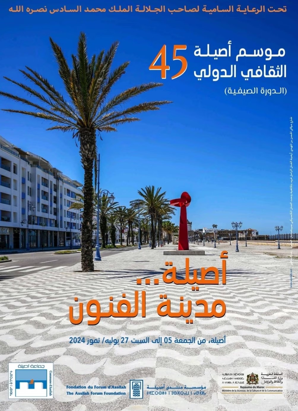 تنظم مؤسسة منتدى أصيلة، بشراكة مع كل من وزارة الشباب والثقافة والتواصل (قطاع الثقافة) و جماعة أصيلة، “موسم أصيلة الثقافي الدولي 45” تحت شعار: “أصيلة..مدينة الفنون”، وذلك في دورتين إحداهما صيفية و الأخرى خريفية.