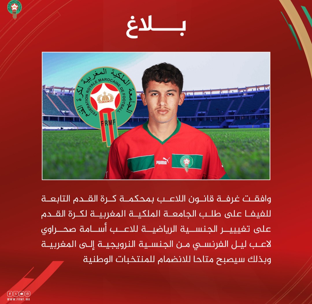 أعلنت الجامعة الملكية لكرة القدم في تغريدة على موقع X (تويتر سابقا) قبل دقائق من الآن، موافقة غرفة قانون اللاعب بمحكمة كرة القدم التابعة للفيفا على طلبٍ تقدمت به الجامعة بخصوص تغيير الجنسية الرياضية للاعب ليل الفرنسي أسامة صحراوي، من النرويجية إلى المغربية.