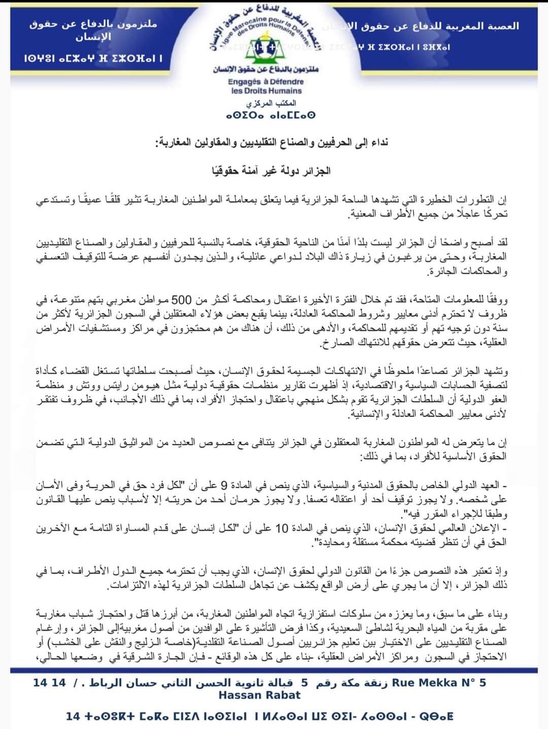 و وجهت العصبة نداءا إلى جميع الحرفيين والصناع التقليديين والمقاولين وكل المغربيات والمغاربة، بتفادي التوجه للجزائر إلى أجل غير معلوم، بسبب الأوضاع الحقوقية المتدهورة و عدم احترام سلطات البلد للمواثيق الدولية و لجوئها إلى تصريف عدائها اتجاه المملكة المغربية عبر الانتقام من المغربيات و المغاربة.