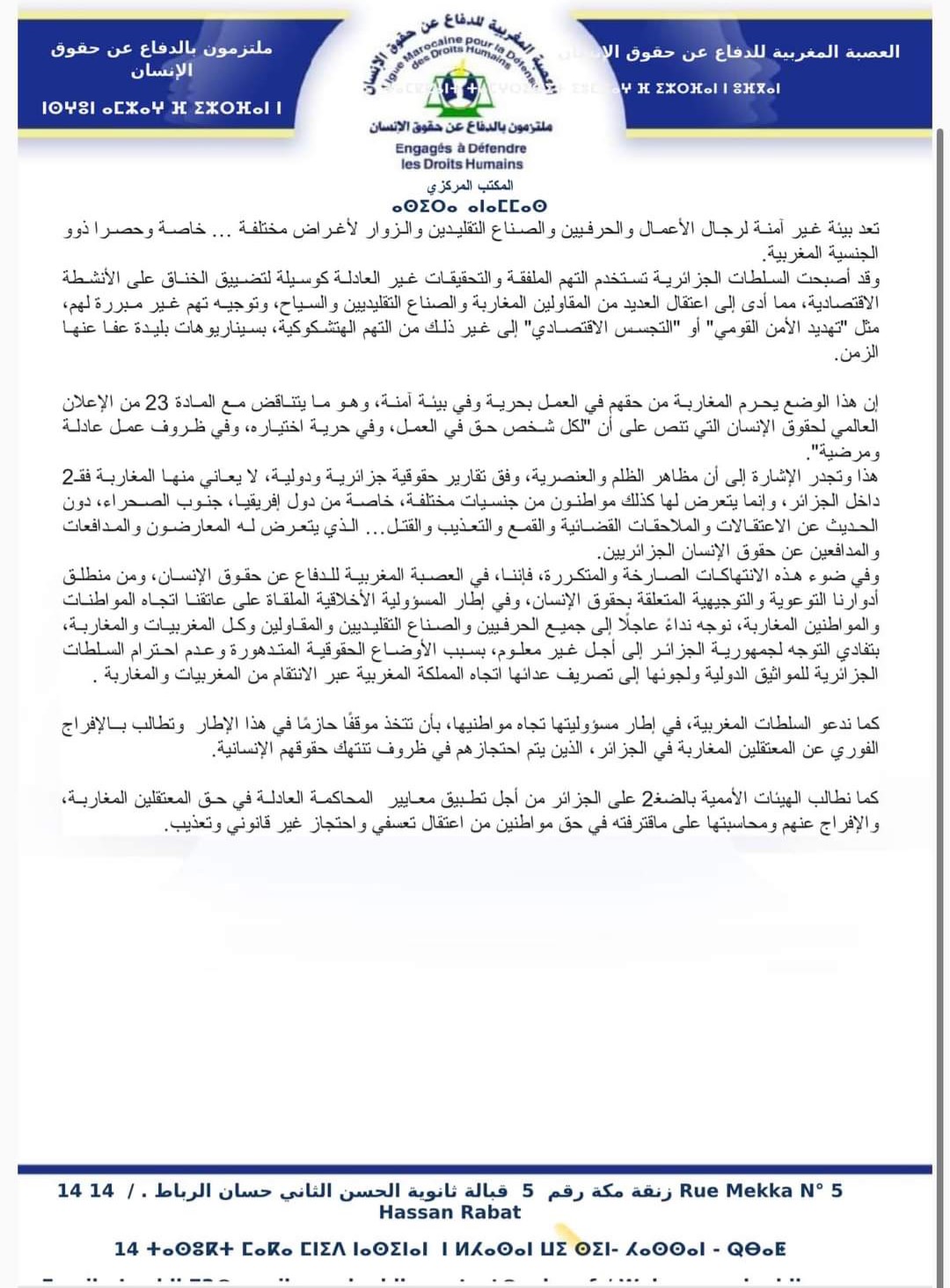 و أفاد البيان إلى أن هذا الوضع “يَحرِم المغاربة من حقهم في العمل بحرية و في بيئة آمنة، و هو ما يتناقض مع المادة 23 من الإعلان العالمي لحقوق الإنسان التي تنص على أن “لكل شخص حق في العمل، و في حرية اختياره، و في ظروف عمل عادلة و مرضية”. مشيرا في الوقت ذاته إلى أن مظاهر الظلم و العنصرية، وفق تقارير حقوقية جزائرية و دولية، لا يعاني منها المغاربة فقط داخل الجزائر، و إنما يتعرض لها كذلك مواطنون من جنسيات مختلفة، خاصة من دول إفريقيا، جنوب الصحراء، دون الحديث عن الاعتقالات والملاحقات القضائية والقمع والتعذيب والقتل… الذي يتعرض له المعارضون والمدافعات والمدافعين عن حقوق الإنسان الجزائريين.
