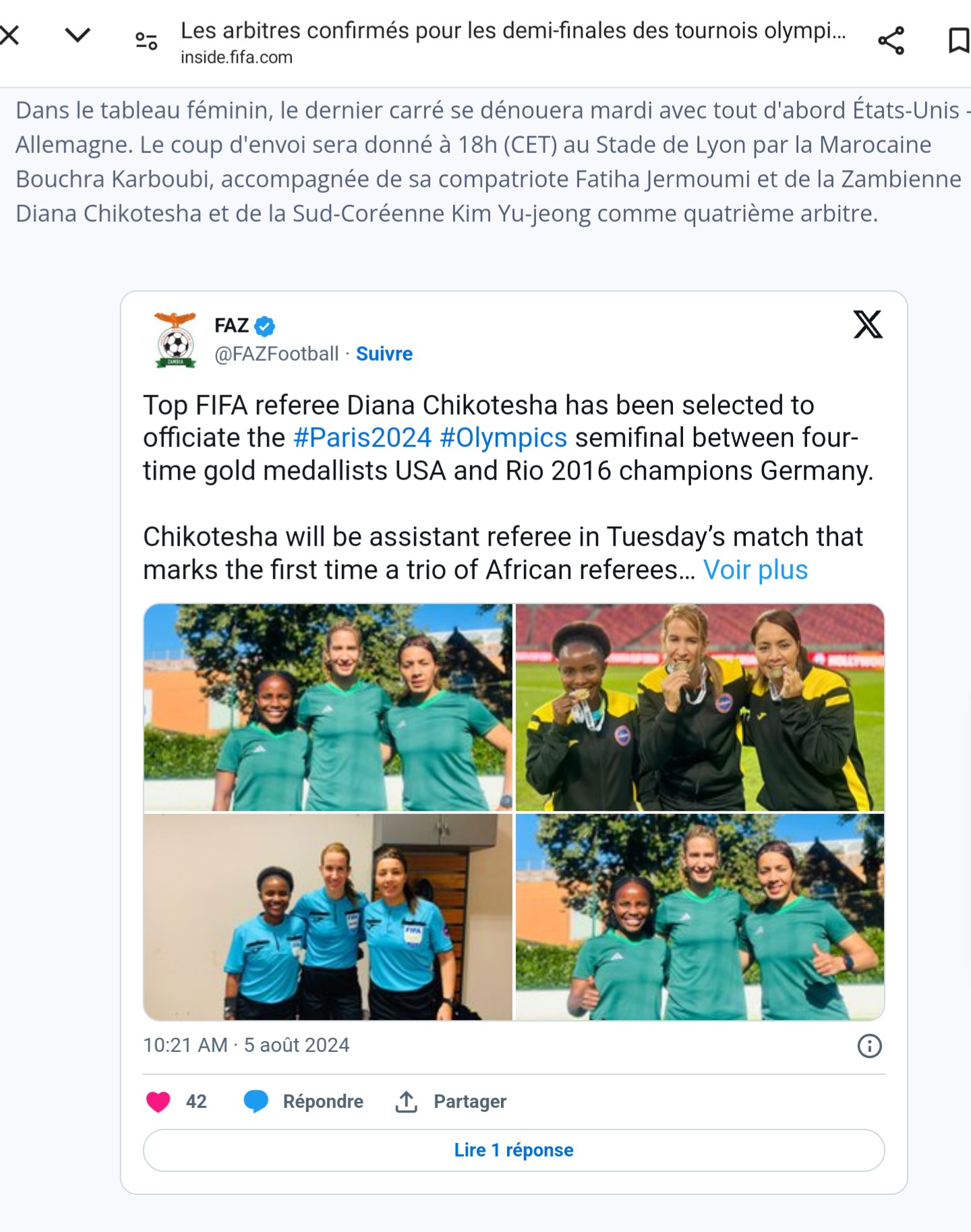حدد الاتحاد الدولي لكرة القدم (الفيفا) اليوم الإثنين، هوية الطاقم التحكيمي لمباراة المنتخب النسوي الأمريكي و نظيره الألماني، التي ستحتضن أطوارها ملعب جيرلاند في مدينة ليون على الساعة الخامسة من مساء غد الثلاثاء، برسم نصف نهائي أولمبياد باريس.