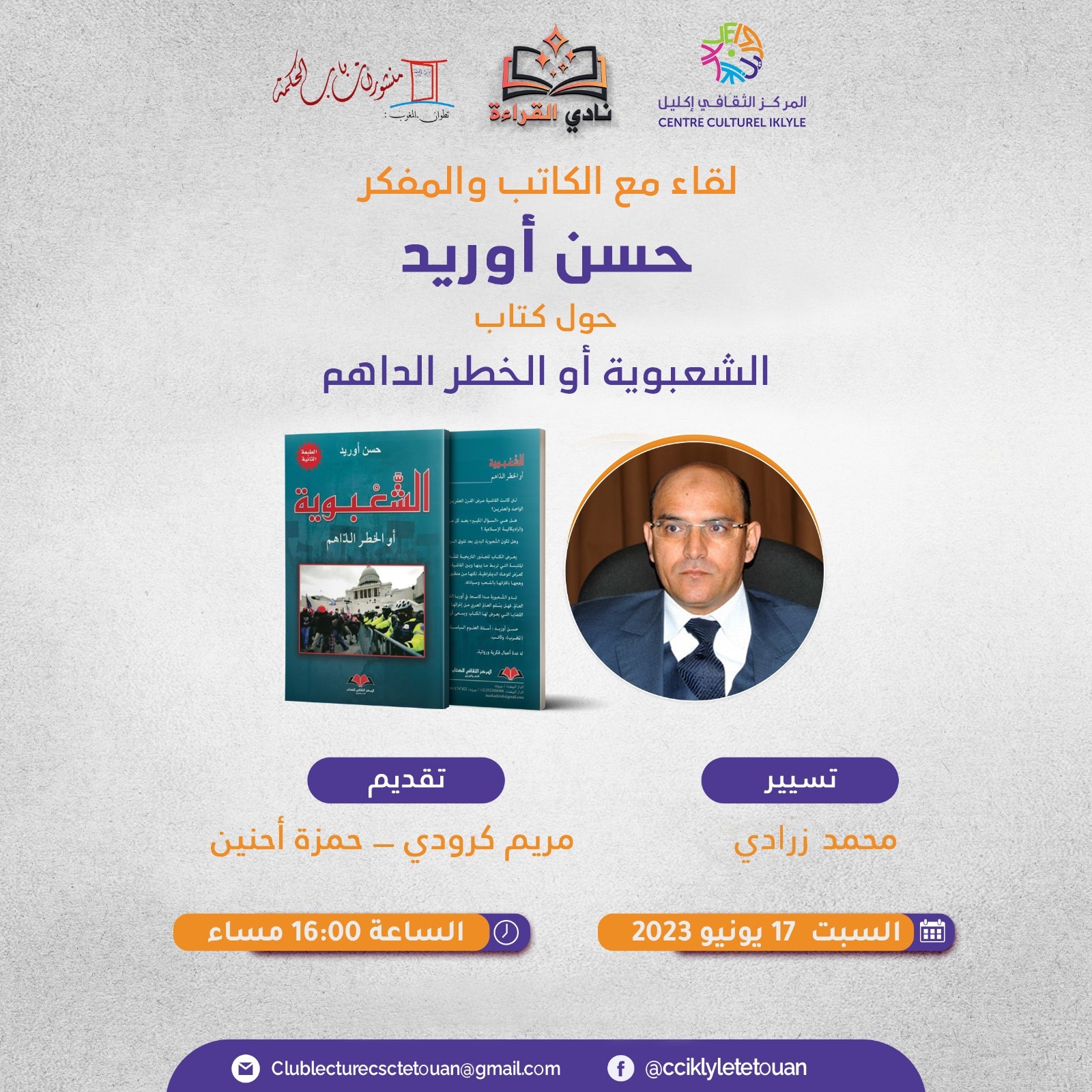 ينظم المركز الثقافي إكليل بتطوان، بشراكة مع مكتبة بيت الحكمة لقاء مع المفكر المغربي حسن أوريد، يوم السبت 17 يونيو 2023.