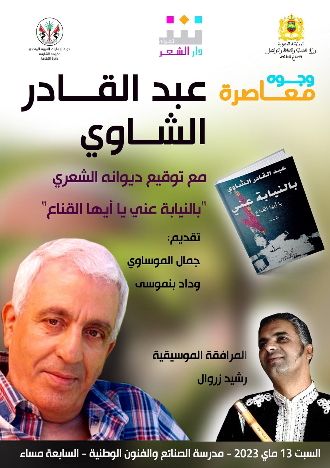 ويحل الشاوي ضيفا على تظاهرة “وجوه معاصرة”، في دورتها الثانية، التي تشهد تقديم وتوقيع ديوانه الشعري “بالنيابة عني يا أيها القناع” بمشاركة الشاعر جمال الموساوي والشاعرة وداد بنموسى، مع مرافقة موسيقية لعازف الناي الفنان رشيد زروال.